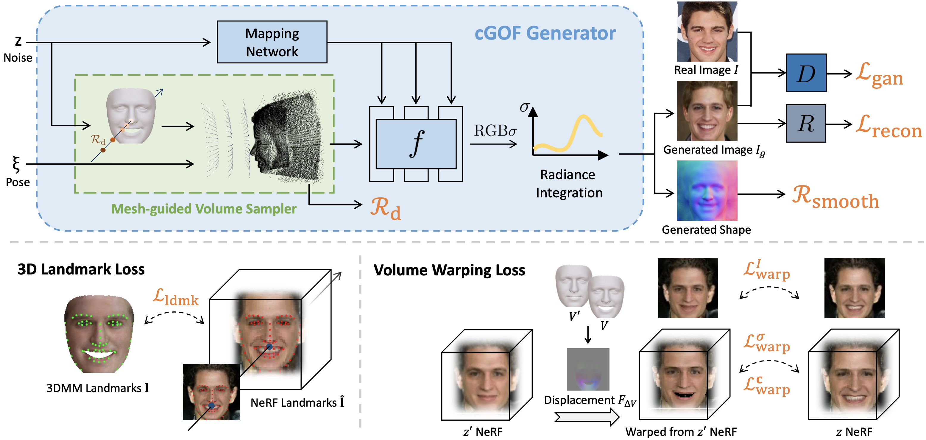 (Top): Conditional Generative Occupancy Field (cGOF) leverages a mesh-guided volume sampler and a distance-aware volume density regularizer, which effectively conditions the generated NeRF on an input 3DMM mesh. It is trained in an adversarial learning framework using only single-view images. (Bottom): The 3D landmark loss encourages the semantically important facial landmarks to follow the input mesh, and the volume warping loss enforces two NeRF volumes generated with different expression codes to be consistent through a warping field induced from the corresponding 3DMM meshes